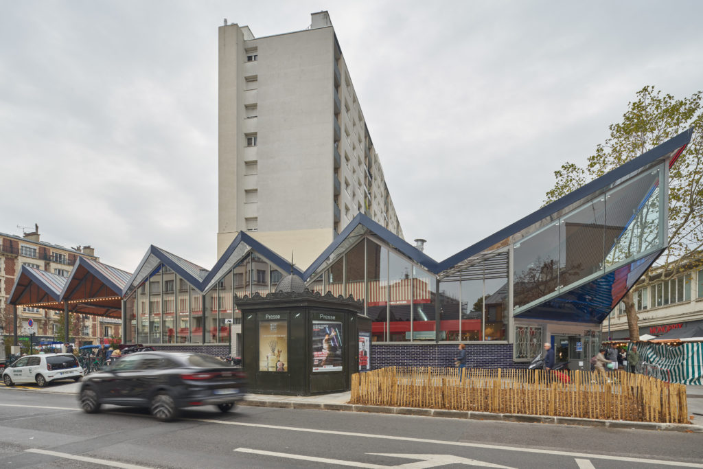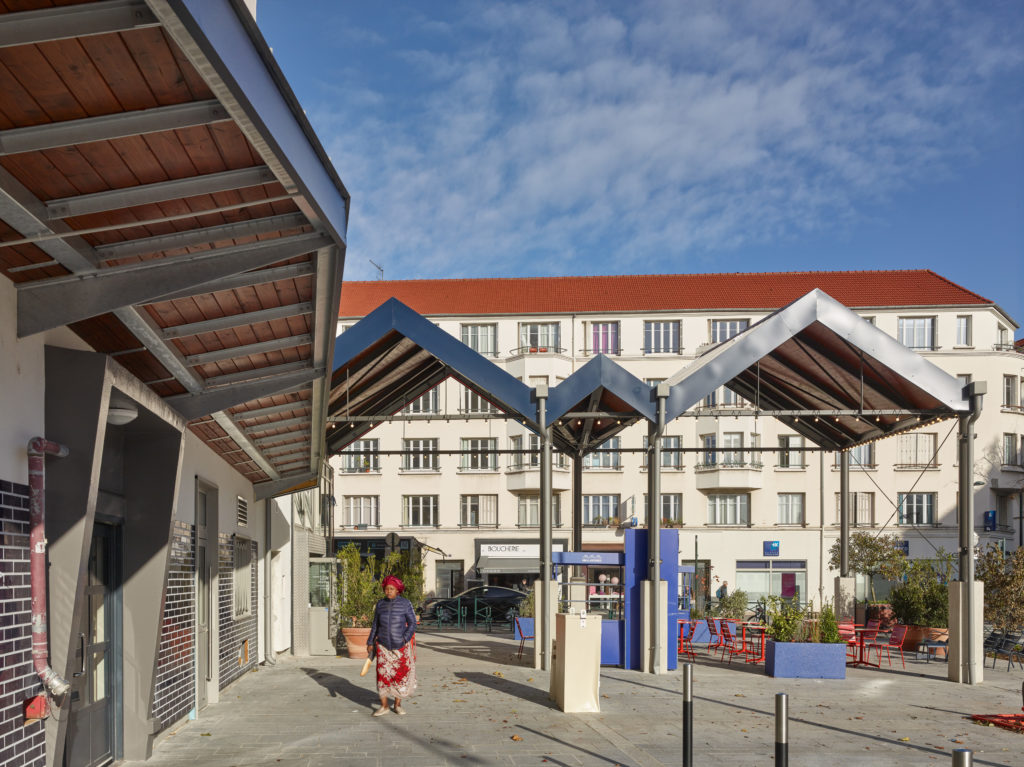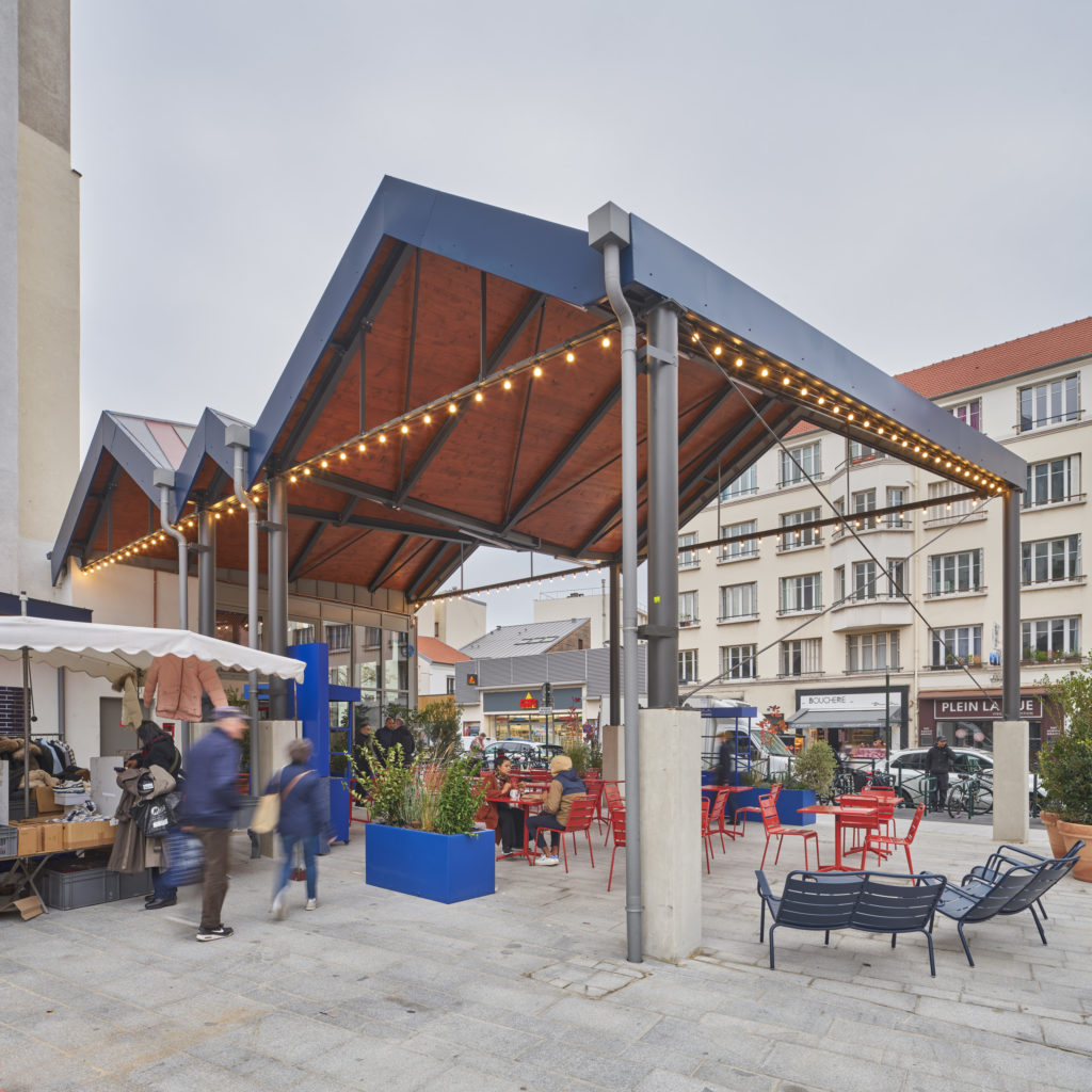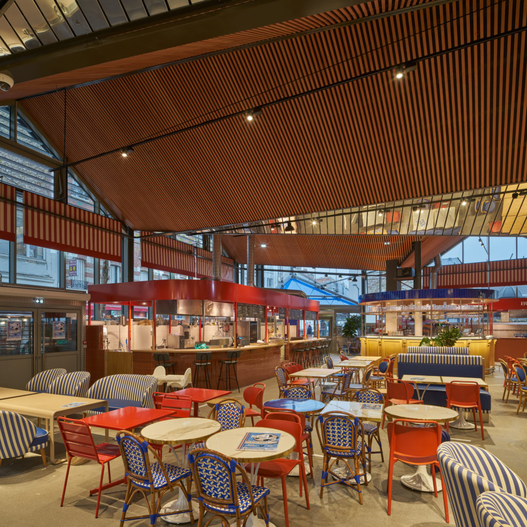 L’extension de la Halle du Marché des Victoires permet la création d’une Halle Gourmande de 671m², dédiée aux commerces de bouche. Ce nouvel espace comprend quatre stands de cuisine du marché, quatre stands de traiteur, ainsi qu’une terrasse couverte de 100m² destinée à la restauration sur place. L’aménagement du sous-sol existant sert de locaux de support. Le chantier s’est déroulé en maintenant l’activité commerciale de la Halle, assurant ainsi la continuité des services.